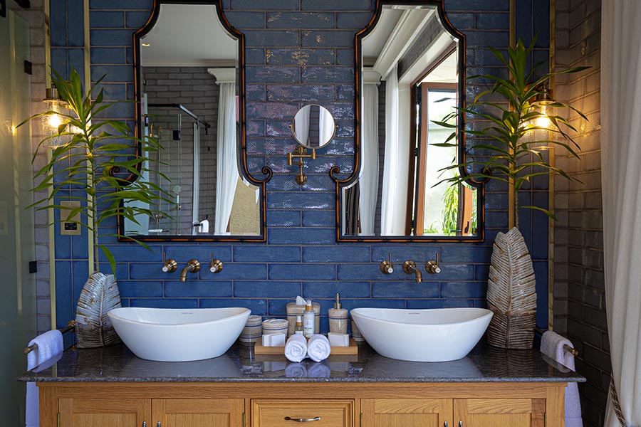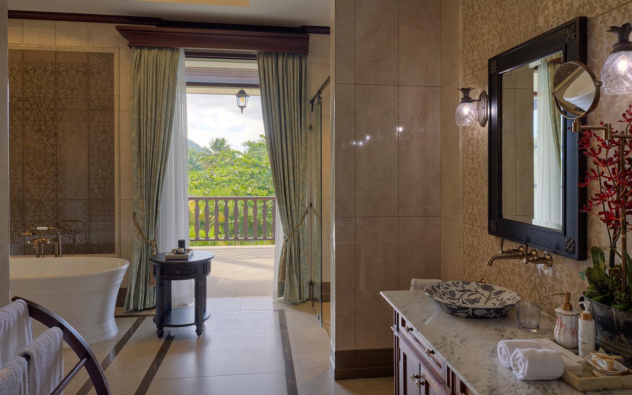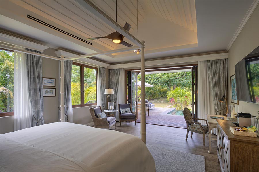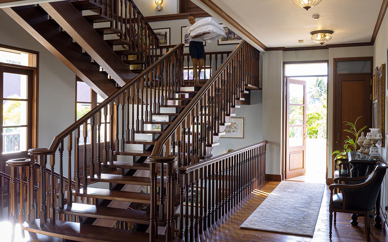 La Cigale Estate was built in 2020 and was designed to reflect the family's long history in the Seychelles. Sustainably harvested and handcrafted colonial-style furniture, handpicked by the owners on their travels around the world, reflects the architectural design of the property, while oil-soaked recycled teakwood from Indonesia gives the floors their timeless shine. Closer to home, wood from a wizened Indian almond tree, known locally as badamier, was salvaged during construction, and repurposed for the bathroom vanity counters, while two takamaka trees from the Estate’s 4.5 acres have been ‘reborn’ among the décor in the generously proportioned living room. A grandiose staircase and elevator allow guests easy access to all three floors.